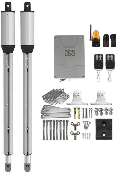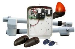 OLASZ - 230V. Orsós kapumozgató szett kétszárnyú kapuhoz, 2db TECHNO400-as motor jobbos és balos, 400 mm löket, max 2,6m-es kapuszárnyhoz, T011AOD vezérléssel, fixkódos rádió vevővel, 2db PTX433305AI-B 3 csatornás rádióadó, 1db TCLAMP-N villogó, 1pár TCFET-N fotocella, – Családi házakhoz, óránként 4-5 nyitás, kiskapu funkció, lassítás, akadályérzékelés, közepes