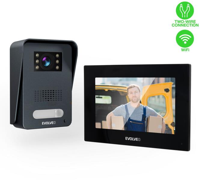 EVOLVEO DoorPhone AP1-2 vezetékes videotelefon alkalmazással fekete színű Otthoni videofon készlet Csatlakozás mindössze 2 vezetékkel 32 GB belső memória 7" monitor Wifivel Smart Life alkalmazás (Tuya) Ajtók, kapuk, kapuk távoli nyitása Tartós kültéri egység kialakítása Az EVOLVEO AP1 egy modern videofon SMART LIFE alkalmazással a távoli irányításhoz, Full HD videóval, eg