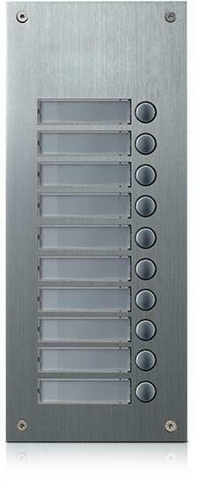 Rozšiřující 10-tlačítkový panel pro systém 4+n. Čelní panel z eloxovaného hliníku s podsvícenými tlačítky a popisnými štítky. Možnost zapojení více rozšiřujících tlačítkových panelů za sebou. Tento panel lze použít s.