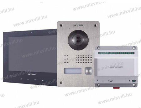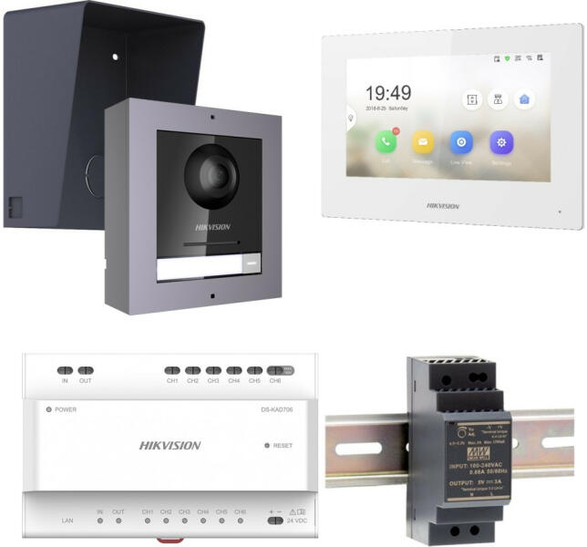 2 vezetékes IP kaputelefon rendszer, melyel könnyedén lecserélhető a régi elavult kaputelefon (új Y jelzésű rendszer) Hikvision DS-KD8003Y-IME2/Surface Társasházi IP video-kaputelefon kültéri főegység 2 Megapixeles kamerával HIKVISION DS-KH6320Y-WTE2-W fehér beltéri egység 7'-os kijelző, Wifi Disztribútor egység DS-KAD706Y 24V tápegység Felületre szerelhető keret + esőv