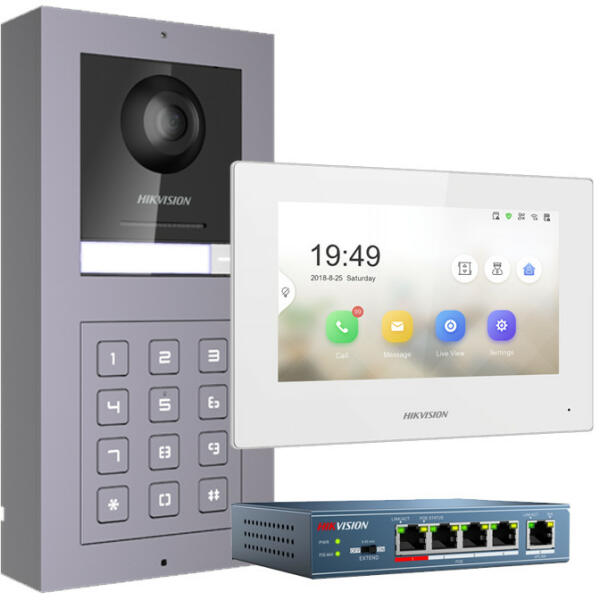 IP kaputelefon szett DS-KD8003-IME1/Surface felületre szerelhető kültéri főegység DS-KH6320-WTE1-W fehér Wifi-s beltéri egység DS-KD-KP kódzár Tartozék esővédő 4 portos standard PoE switch DS-KD-ACW2 felületre szerelő keret Riasztási funkciók Mobiltelefonos elérés Felületre szerelhető, alapesetben egylakásos kaputelefon főegység. Beépített 2 Megapixeles, széles látós