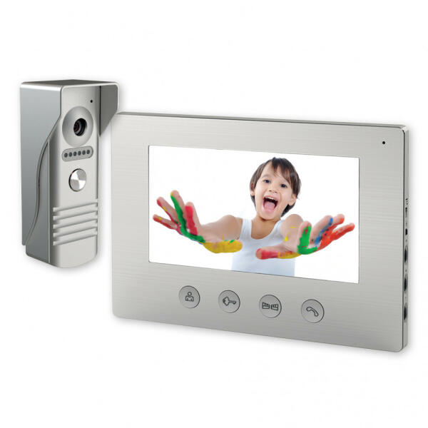 Video kaputelefon, színes, 7 colos kijelzővel, 16 csengőhang, 2 kapunyitó gomb, IP44-es kültéri egység kamerával, éjszakai felvétel