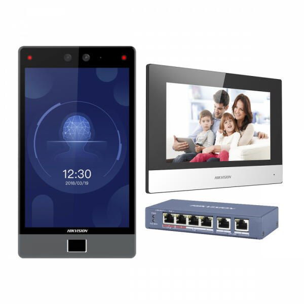 Arcfelismerős, újjnyomatos IP kaputelefon szett, LTE, fehér beltéri egység 8" DS-K1T680DFG MinMoe arcfelismerős, újjnyomatos kültéri egység + tápegység DS-KH6320-WTE1 Wifi-s beltéri egység 4+2 portos standard PoE switch Riasztási funkciók Mobiltelefonos elérés Bővíthető több beltéri egységgel, akár többlakásos használatban is A legújabb Hikvision kaputelefon 100000 arc