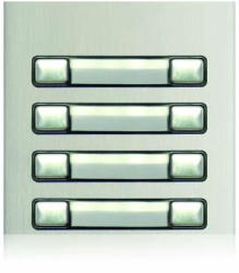 4x2 (8) nyomógombos kültéripanel Golmar N sorozatú kültéri egységekhez névtáblával - 8 nyomógombos kültériegység. - Nyomógombok elrendezése, egymás mellett, 4 sorban. - Erős, 1.8 mm vastag, anódizált, préselt alumínium előlap. - Névtábla, fehér LED-es háttérvilágítással. - Felső, és oldalsó záró keret és süllyesztett doboz nélkül (opcionális). - Külső mé
