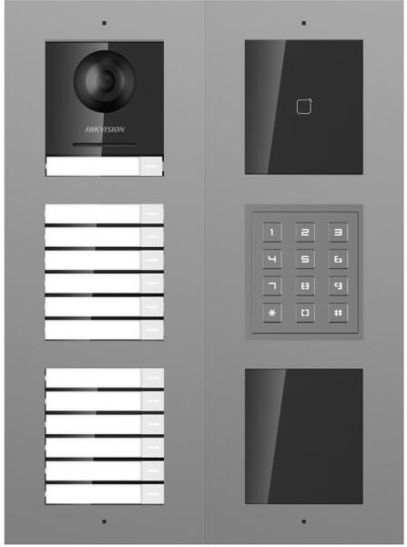 13 lakásos (bővíthető) IP video-kaputelefon szett DS-KD8003-IME1 (B) kültéri főegység (1 lakás) DS-KD-KK nyomógomb (12 lakás) DS-KD-M Mifare kártyaolvasó DS-KD-KP kódzár DS-KD-ACW3 felületre szerelhető keret 12V DC zárkimenet 2 relékimenet ajtó/kapunyitáshoz Átrendezhető modulsorrend Riasztási funkciók Felületre szerelhető, alapesetben hétlakásos kaputelefon főegység