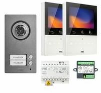 Kültéri egység és lakáskészülék, köztük 2 eres kommunikáció elektromos zárvezérlésA csomag tulajdonságai Lakáskészülék külső tápegységet igényel (12 VAC/VDC). Kültéri egység és lakáskészülék között 2 eres kommunikáció, zárvezérléssel. Elektromos zárvezérlés. Ajtónyitás gomb az elektromos zárhoz. Elektromos zár működtetéséhez külön tápegység ne