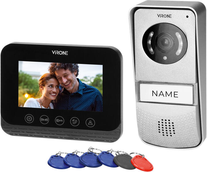 Az ENIF fekete színű ENIF video-ajtótelefonkészletet családi házakba történő telepítésre tervezték, és nem igényel kézibeszélőt. A készlet tartalmaz egy többszínű, 4,3"-os LCD-síkképernyős monitort, amelyet funkcionális érintőgombokkal lehet működtetni, valamint egy robusztus kültéri egységet érintésmentes címkeolvasóval. Az infravörös megvilágítás kiváló