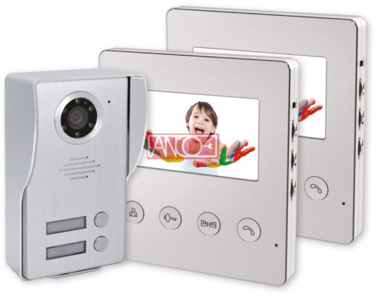 Video kaputelefon, színes, 4,3 colos kijelzővel, 16 csengőhang, 2 kapunyitó gomb, IP44-es kültéri egység kamerával, éjszakai felvétel