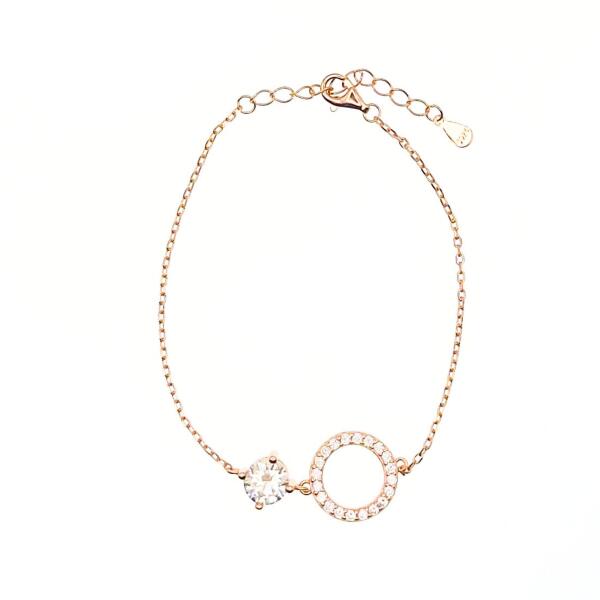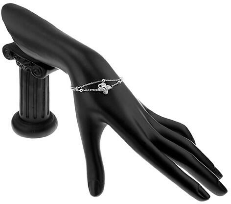 A állítható, 925 ezüst karkötő ferdén összekapcsolt, ovális szemekből álló finom láncból tevődik össze, középen megkettőzve. A láncokat kilenc kis, fényes golyó és egy négylevelű lóhere alakú medál díszíti. A négylevelű lóherének hajlított a szára és átlátszó cirkóniákkal van kirakva. Delfinkapcsos zárszerkezet. Felülete ródiummal kezelt. Négylevelű l