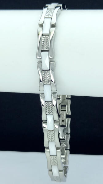 Ezüstszínű nemesacél (316L) karkötő fehér kerámia és mart minta díszítéssel. A kerámia a karkötő két harmadát díszíti. A kerámia és a nemesacél előnyös tulajdonságainak köszönhetően nem törékeny, nem kopik, nem színezi a bőrt. Minőségi, tartós antiallergén ékszer. Hosszúság: 19,8 cm. Szélesség: 8 mm. Igény esetén rövidíthető, melyet térítésmentesen
