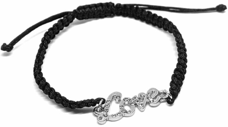 Ezüst színű kristályos Love feliratos karkötő, fekete makraméval. Paraméterek: Charm mérete 3x1,2 cm. Anyaga fémötvözet és kristály, karkötő anyaga szövet, mérete állítható. Romantikus, letisztult ékszer, egyszerű love feliratos medál egyszerű karkötővel, mégis, ez a legkülönlegesebb ajándék.