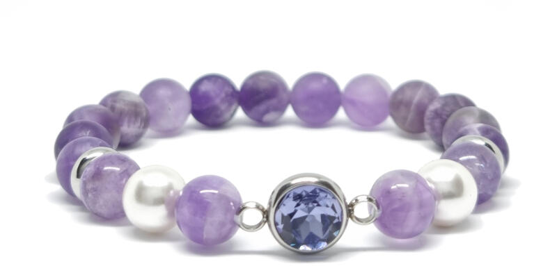 Kiváló minőségű valódi ametiszt matt ásványból készült ásvány karkötő. Az ametiszt karkötő finom lila árnyalatával harmóniát és nyugalmat sugároz, miközben az ásványt hagyományosan a tisztánlátás és belső egyensúly jelképeként viselik. A karkötő valódi ametiszt, shell pearl (fehér) 8-9 mm ásványból és nemesacél köztes és szív logó dísszel készült.