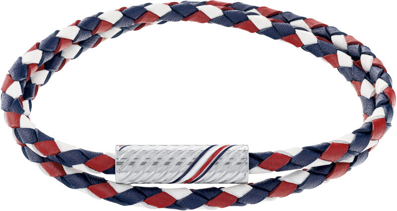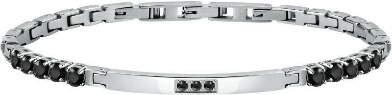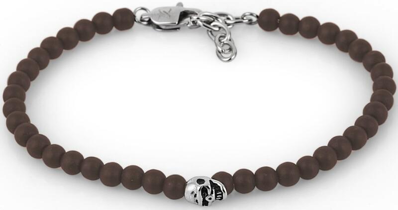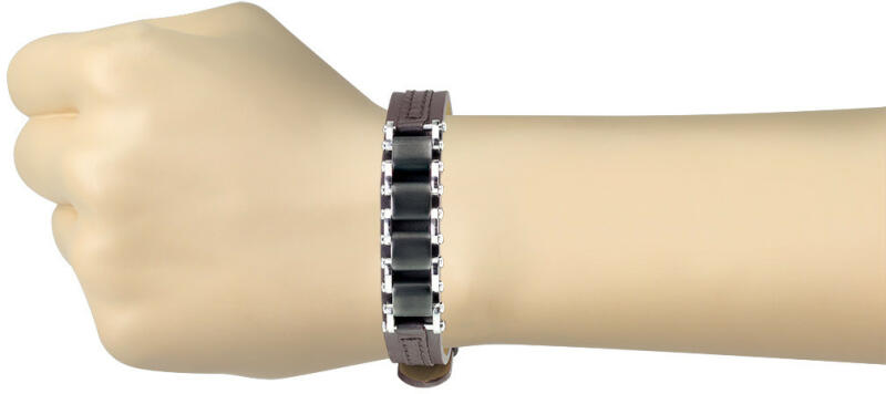 A bőr karkötő barna színű kivitelben készült. Egy biciklilánc motívum díszíti, amelyet fekete matt hengerek alkotnak, amelyeket ezüst színű szegecsek kapcsolnak össze. A lánc mindkét oldalról vékony megemelt sávokhoz van rögzítve, amelyek egy vastagabb szíjhoz vannak varrva. Órakapcsos zárszerkezet. Szélesség: 12 mmA karkötő hossza: 250 mm (+/- 5 %)A lánc mérete: 11