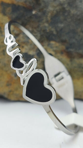 Ezüstszínű nemesacél (316L) karperec, melyet szív minta, love szöveg és fekete tűzzománc jellegű festés díszít. A karperec kinyitható ( rugós ) a könnyebb felhelyezés érdekében. Minőségi, tartós anyagának köszönhetően akár mindennapi viseletnek is alkalmas. Antiallergén ékszer. Karperec szélessége: 2 mm. Karperec belső átmérője: 58 mm. Szív és love szöveg mér