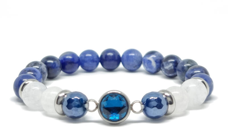 Kiváló minőségű valódi szodalit ásványból készült ásvány karkötő. A szodalit karkötő mélykék árnyalatával a nyugalmat és önbizalmat erősíti, miközben a tiszta kommunikáció és belső harmónia szimbólumaként viselik. A karkötő valódi szodalit, hegyikristály matt, achát fazettált aura kvarc 8-9 mm ásványból és nemesacél köztes és összekötő dísszel kés