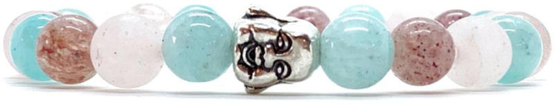 Egyedi ásvány karkötő Buddha fej köztes dísszel A 8mm-e Amazonit, Rózsakvarc és Eperkvarc ásvány golyókból készült egyedi ásvány karkötő speciális gumis damilra van fűzve, dagi buddha köztes díszítéssel. Amit a Rózsakvarc ásványról tudni kell: A festetlen rózsakvarc az egész világos, szinte áttetszőtől, a ködös középrózsaszínig terjed. Az egyik legnépszerű