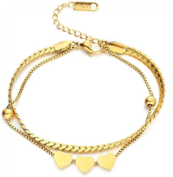 Bernica Karkötő Szépséges, divatos, nőiesen finom Bernica karkötő verhetetlen áron. Szívecske medálokkal díszített. Az ékszer nem tartalmaz nikkelt, ezért érzékeny bőrű emberek is viselhetik. Tulajdonságok: A karkötő hossza: 14cm + 4cm Díszítése: Szívecskék Anyaga: Nemesacél Szín: Arany