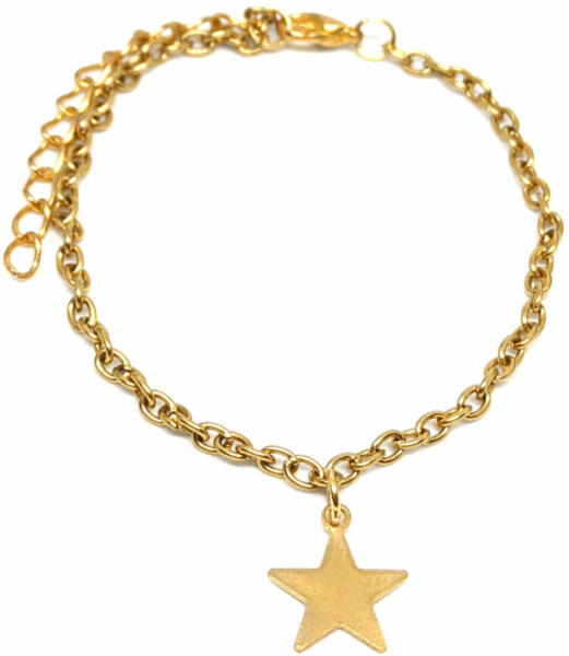 Csillag charmos karkötő, arany színű Pa raméterek: Cha rm mérete 1,4 cm. Anyaga nemesacél, karkötő anyaga rozsdamentes acél. Karkötő mérete 17+5 cm. (Ha ettől eltérő méretet szeretnél, rendeléskor a MEGJEGYZÉSBE írd be. )