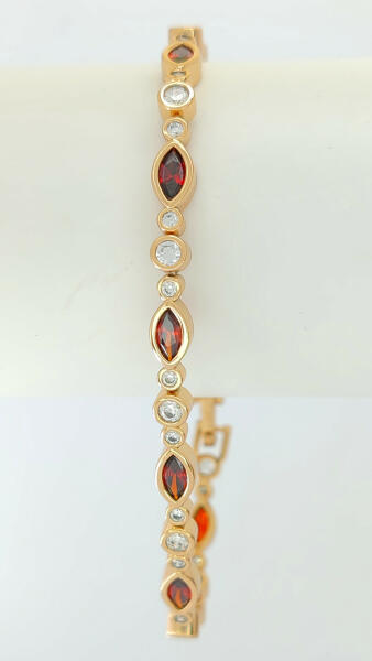 Aranyszínű karkötő, melyet fehér és bordó cirkónia kristályok tesznek csillogóvá. A kristályok ragasztott, peremezett foglalatban helyezkednek el és a karkötő teljes hosszát díszítik. Időtálló ékszer, nem feketedik, nem színezi a bőrt ("gold filled"). Mindennapi használatra is tökéletes választás. Antiallergén ékszer. 18K arany színben kapható. Karkötő szélessé