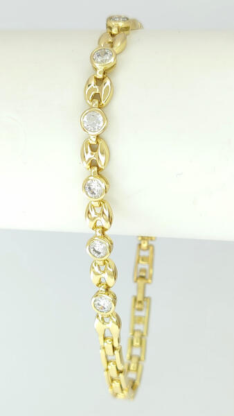 Aranysárga színű karkötő, melyet fehér cirkónia kristályok tesznek csillogóvá. A kristályok ragasztott, peremezett foglalatban helyezkednek el. Időtálló ékszer, nem feketedik víz hatására sem. Mindennapi használatra is tökéletes választás. Antiallergén ékszer. 14K arany színben kapható. Karkötő szélessége: 5 mm. Az antiallergén ékszerek olyan fémötvözetből kés