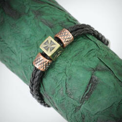 A fekete bőr karkötő egy hosszú fonattal, amely az egyik végén egy acélgyűrűn keresztül megy át, és visszatér az elejére. Ez egy kettős fonat benyomását kelti. A karkötőt henger és kocka alakú patinás medálok díszítik. A réz színű henger felületén átlós barázdák vannak, az acélszürke hengereken körbe a felirat található. A kocka alakú medál mindkét oldalá
