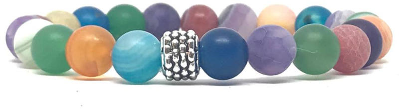 Egyedi ásvány karkötő A 8mm-es Achát ásvány golyók gumis damilra vannak felfűzve, fém köztes díszítéssel. Amit az achátokról tudni kell: Az achát rengeteg színben fellelhető, többnyire szürke, kékesszürke, zöldesszürke, szürkésfehér, barna csíkos, áttetsző. Az achátok testi és lelki hatásai: Tisztítja az aurát. Megnyugtatja az elmét, ezért gondolattisztító.