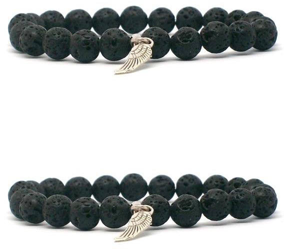 2 darabos ásvány karkötő szett 8 mm-es Lávakő ásvány golyókból speciális gumis damilra fűzött páros karkötő, angyalszárny medál díszítésselA Lávakő testi lelki hatásai: -méregtelenít, -segíti a sejt, -vízutánpótlást, -erősíti az izmokat, -segíti kötőszövet regenerálódást, -vérkeringés és idegrendszer támogató. A lávakő gyógyító hatását már több