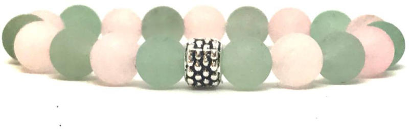Egyedi ásvány karkötő A 8mm-e Rózsakvarc és Aventurin ásvány golyókból készült egyedi ásvány karkötő speciális gumis damilra van fűzve, fém köztes díszítéssel. Amit a Rózsakvarc ásványról tudni kell: A festetlen rózsakvarc az egész világos, szinte áttetszőtől, a ködös középrózsaszínig terjed. Az egyik legnépszerűbb kövek egyike, amely szépséges küllemé
