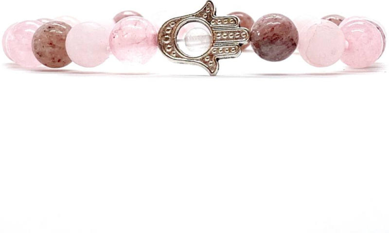 Egyedi ásvány karkötő Hamsa-védelmező kéz dísszel A 8mm-e fényes és matt Rózsakvarc és Eperkvarc ásvány golyókból készült egyedi ásvány karkötő speciális gumis damilra van fűzve, Hamsa kéz köztes díszítéssel. Amit a Rózsakvarc ásványról tudni kell: A festetlen rózsakvarc az egész világos, szinte áttetszőtől, a ködös középrózsaszínig terjed. Az egyik leg