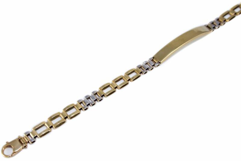 Modern stílusú, kedvelt fazonú, üreges, áttört kialakítású, ródiummal bevont, közepén lapbetéttel díszített, férfi arany karkötő.