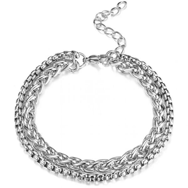 Easy Double Karkötő Ez a fém karkötő, mely kétféle stílusú láncból áll, kombinálja a nőies finomságot a robusztussággal, ami miatt ideális kiegészítő lesz. Minimalisztikus, de stílusos kialakítása tökéletesen kiegészít bármilyen öltözéket az üzletitől az alkalmi viselésig. A karkötő a részletekre és a minőségre odafigyleve készült, ami biztosítja, hogy ho