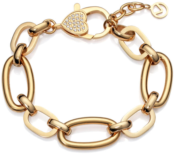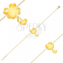 585 sárga arany karkötő, finom láncból és négylevelű lóheréből áll. A lóhere egyik sarkában egy kivágott szimmetrikus szív található. A lóhere alján egy rövid lánc függ, melyen egy tömör szívecske csüng. A karkötő hossza állítható, stekkeres zárszerkezet. Medál méretei (szívvel): 14 x 26 mmLánc szélessége: 0,8 mmKarkötő hossza: 185 mmHosszabbító rész: 20