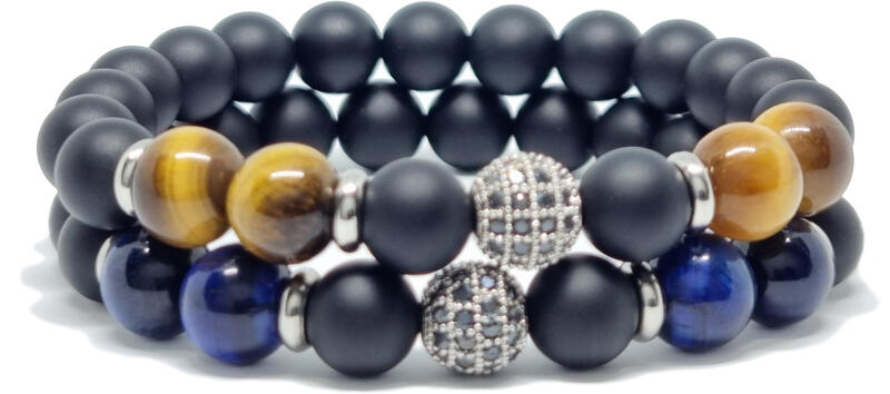 Kiváló minőségű valódi ónix matt ásványból készült páros ásvány karkötő. Az ónix karkötő mély fekete árnyalatával és erőteljes megjelenésével stílusos kiegészítő, amely magabiztosságot és stabilitá st sugall viselőjének. A karkötő valódi ónix matt, tigrisszem, kék tigrisszem 8-9 mm ásványból és nemesacél köztes és cirkón gömb dísszel készült. Az