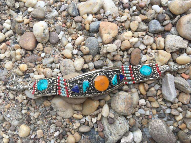 Tibeti ezüst kézzel készített karkötő, türkiz, korall és lapis lazuli kövekkel