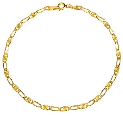 Karkötő 14K sárga aranyból váltakozó vékonyabb hosszúkás szemekből és lapos elemekből, melyek csillogó sugaras vésetekkel díszítettek. Delfinkapoccsal záródik. A karkötő szélessége: 3 mmA karkötő hossza: 190 mm (+/- 5%)A zárószem szélessége: 2,3 mmA karkötő súlya: 1,42 gFémjelzéssel ellátott.