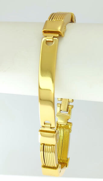Aranyszínű nemesacél (316L) karkötő. Tartós, minőségi ékszer, nem kopik, nem színezi a bőrt. Mindennapi viseletnek is tökéletes választás. Antiallergén ékszer. 14K arany színben kapható. Hosszúság: 21 cm. Szélesség: 10 mm. Gravírozható betét mérete: 8 mm x 45 mm. A gravírozást partnerünk végzi, kérjük előre utalásos, vagy utánvétes fizetési módot válasszon,