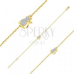 A kombinált 585 arany karkötő egy láncból és egy medálból áll. A sima és fényes medál macska alakú, amelynek hullámos a farka. A sekély, fehérarannyal díszített bemetszés átlátszó kerek csiszolt cirkóniákkal van kirakva. A vékony láncot egymásra merőlegesen összekapcsolt, ovális szemek alkotják. A karkötő hossza állítható és delfinkapoccsal záródik. A medál