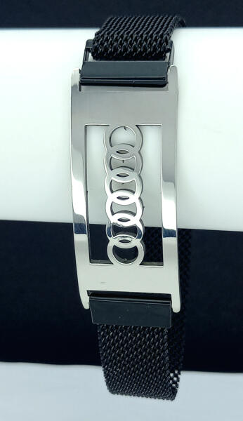 Fekete-ezüstszínű nemesacél ( 316L ) sodrony karkötő, melyet áttört mintás betét díszít. A nemesacél tulajdonságainak köszönhetően nem kopik, nem szineződik. Tartós, minőségi antiallergén ékszer. Szélesség: 14 mm. Karkötő teljes hossza: 24,5 cm. Betét mérete: 20 mm x 48 mm. A karkötő mágneses modern zárral rendelkezik, ami lehetővé teszi a karkötő tetszőleges
