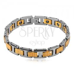 A fényes, volfrám, kétszínű karkötő H alakú és téglalap alakú elemekből tevődik össze, amelyeknek apró, kiemelt négyzetek vannak a felületén. A karkötő hátoldalán, minden téglalap alakú elemben szürkésfekete mágneses golyók vannak beülteteve. Órakapcsos zárszerkezet. Hossz: 180 mmSzélesség: 9 mm