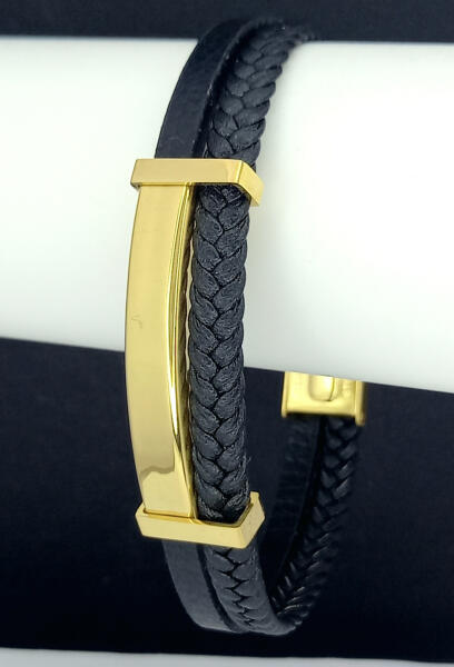 Fekete, két soros valódi bőr karkötő, aranyszínű nemesacél (316L) díszítéssel és csattal. Kényelmes, tartós viselet, nem feketedik. Antiallergén ékszer. 14K arany színben kapható. Karkötő hossza: 21 cm. Betét hossza: 42 mm. Karkötő szélessége: 13 mm. Igény esetén rövidíthető, melyet ajándékként elvégzünk. A kért méretet kérjük a megjegyzés rovatban feltünte