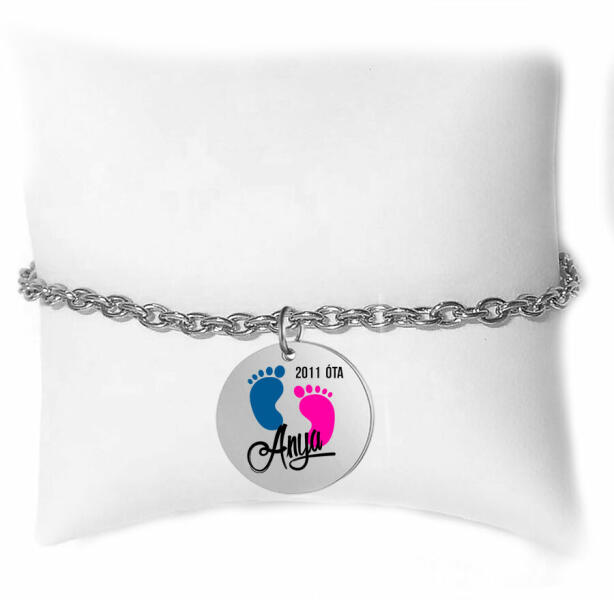 Paraméterek: – A vékonyabb karlánc: A szemek 4x3 mm-esek, vékony, elegáns, diszkrét (de azért nem a legvékonyabb karlánc). A karlánc anyaga rozsdamentes acél! A felirat lapocska kb. 30x6 mm-es, rozsdamentes tüköracél. – Vastagabb karlánc: A szemek kb. 9x7 mm-esek, nem nagyon vastag, nem is vékony. A karlánc anyaga rozsdamentes alumínium. A felirat lapocska kb. 30x6 mm-es, roz