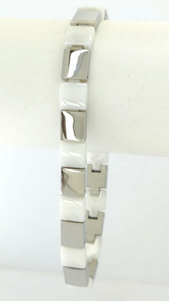 Ezüstszínű nemesacél betéttel díszített fehér kerámia karkötő, melynek kerámia szemeit metszés díszíti. A nemesacél és kerámia előnyös tulajdonságainak köszönhetően nem törékeny, nem kopik, nem feketedik. A kerámia teljes anyagában színezett, nem veszít fényéből. Tartós, minőségi antiallergén ékszer. Karkötő hossza: 20 cm. Karkötő szélessége: 7 mm. Igén