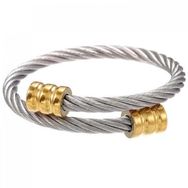 Lord Karkötő Modern Lord karkötő uraknak verhetetlen áron. Az ékszer nem tartalmaz nikkelt, ezért érzékeny bőrű emberek is viselhetik. A karkötőt szét kell húzni, hogy a csuklóra lehessen tenni. A végein lévő díszek mágnesesek. Tulajdonságok: A karkötő max. mérete: 22cm Szín: Ezüst/Arany Anyaga: Nemesacél
