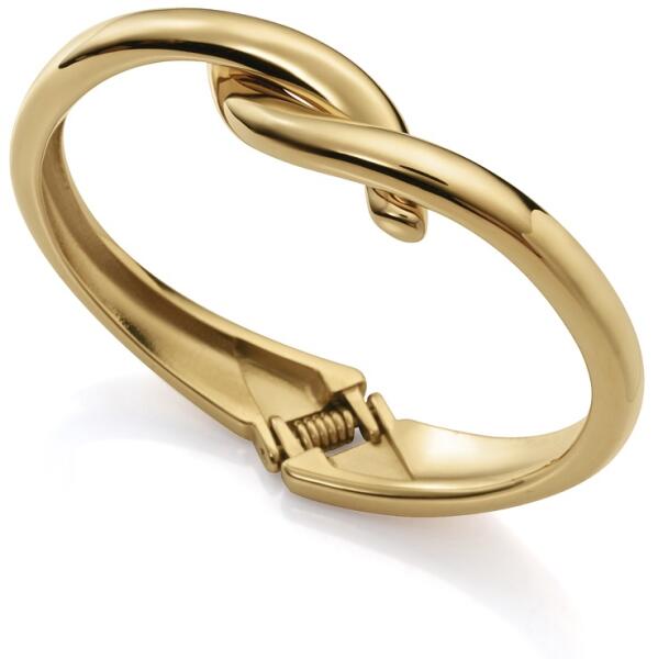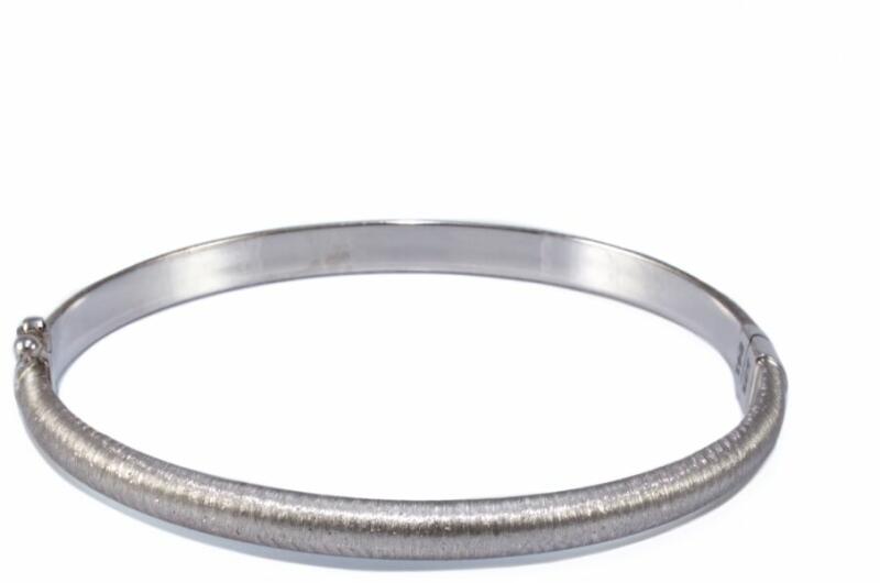 Modern stílusú, üreges, de masszív kialakítású, ródiummal bevont, mattírozással ékített, praktikusan nyitható arany karperec.