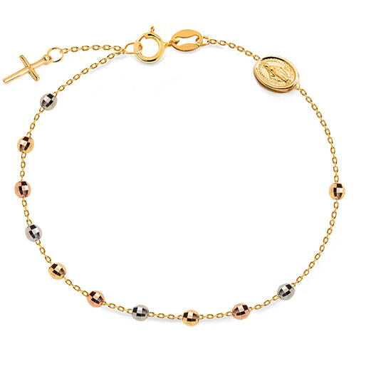 Rendkívüli karkötő rózsafüzér kivitelben. A keresztes csillogó gyöngyöket horgonymintás láncra helyezzük. A rögzítés biztonságos tollgyűrűvel történik. A kereszt szélessége 6 mm, magassága 13 mm, válassza ki a karkötő hosszát a rendelkezésre álló méretek közül. Kombinált tizennégy karátos aranyból készült, három színárnyalatú sárga, fehér és rózsasz