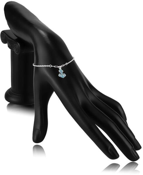 925 ezüst karkötő egy vékony lánccal, amely kis ovális láncszemekből áll, amelyek függőlegesen kapcsolódnak egymáshoz. A lánc közepén öt nagyobb, fazettált szélű láncszem található, amelyekhez egy horgony alakú medál van rögzítve. A horgony türkiz színű, kerek kövekkel van díszítve. A lánc rugós gyűrűzárral rendelkezik. A lánc szélessége: 1,1 mmA nagyobb l
