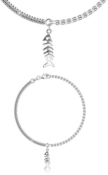 A 925 ezüstből készült karkötő függőlegesen összekapcsolódó kettős lánc, az egyik ovális láncszemekből áll. A karkötő másik felét kocka mintázatú láncszemek alkotják. A karkötőt halcsont alakú medál díszíti. A karkötő homár karmos zárral rendelkezik. Ovális láncszemek láncszélessége: 1,5 mmKockás láncszélesség: 2 mmKarkötő hossza: 180 mm (+/- 5%)Medál