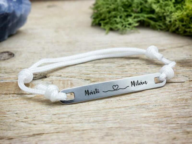 Ezt az egyszerű, de mégis egyedi karkötő ajándék ötlet ünket e gy microcord zsinór , és egy acél medál alk ot ja . A karkötőt egy lap alakú 49×6,3 mm-es méretű elegáns acél medál díszíti, amit gravírozunk , így személyesebbé téve az ajándékot . A nemesacél más néven orvosi fém medál nem allergizál , ezért fémre érzékenyeknek is bátran ajánljuk . Mindemelle