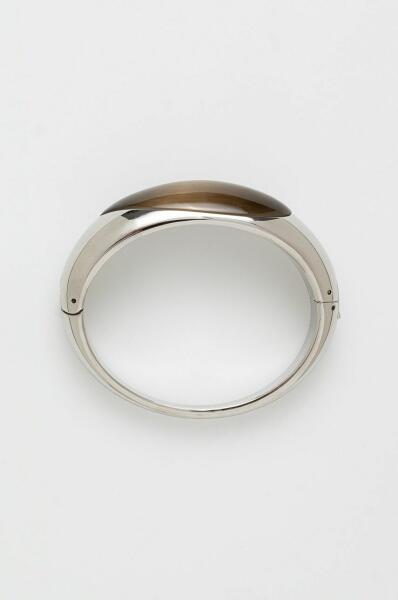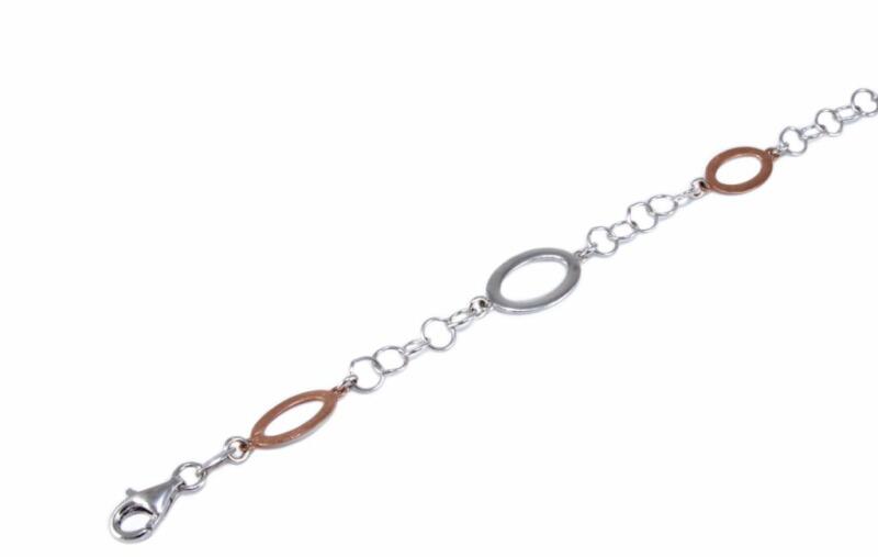 Modern stílusú, ródiummal bevont, rozé arannyal díszített, ovális szemes ezüst karkötő.