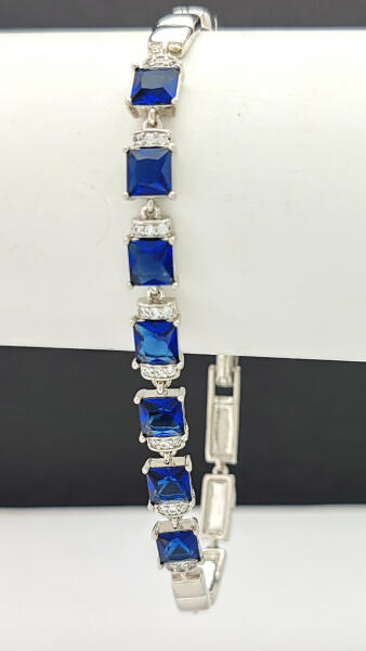 Ezüstszínű karkötő, melyet királykék és fehér cirkónia kristályok tesznek csillogóvá. A kristályok a karkötő első harmadát díszítik. A kristályok karmos foglalatban helyezkednek el. Időtálló ékszer, nem feketedik víz hatására sem ("gold filled"). Mindennapi használatra is tökéletes választás. Antiallergén ékszer. Karkötő szélessége: 6 mm. Az antiallergén ék